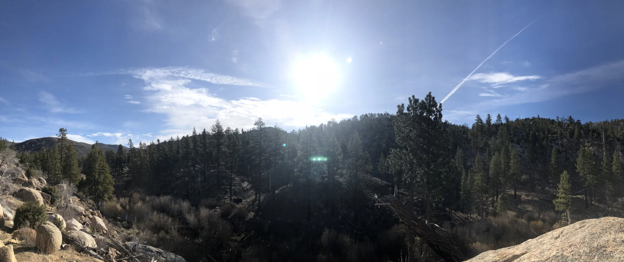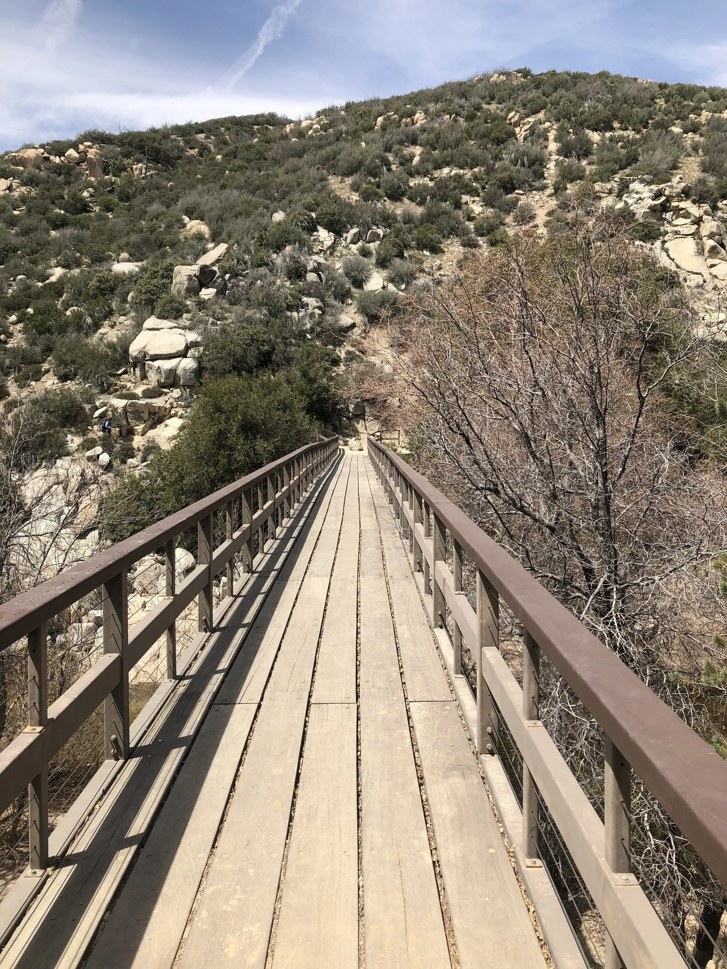 We got our first (cloudy) views of Mt. Baden-Powell as we approached Deep Creek, which we first crossed on a massive wooden bridge. Maybe not massive on a real-world scale, but out here anything that counts as an evolved modern structure goes.